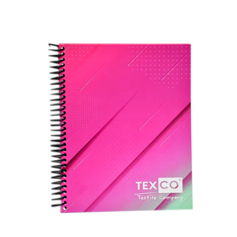 Descripción del Producto: Este cuaderno corporativo de Texco Textile Company destaca por su diseño vibrante y moderno. La cubierta, en un llamativo color magenta con un sutil degradado que incluye tonos verdes, presenta un patrón abstracto de líneas y puntos que le dan un toque dinámico y actual.