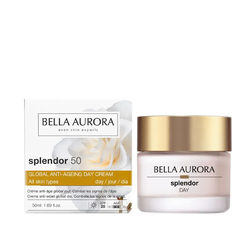 Splendor Crema antiedad dia actúa sobre cada uno de los 10 signos de envejecimiento de la piel: antiarrugas, reduce manchas oscuras, ilumina, unifica el tono, redensifica, efecto tensor, hidrata, regenera, protección UVA, UVB, IR, HEV. Con Camelia oleifera, el secreto de belleza de las geishas, reconocido por su efecto restaurador y rejuvenecedor de la piel.