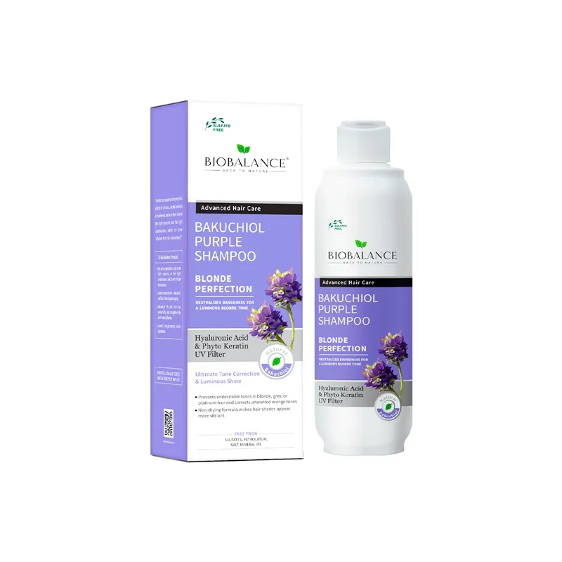 El shampoo de Biobalance Orgánico con Bakuchiol Púrpura es un producto especializado que no solo limpia, sino que también cuida y tonifica el cabello claro, rubio o con mechas. Su fórmula combina ingredientes naturales con tecnología para el color.