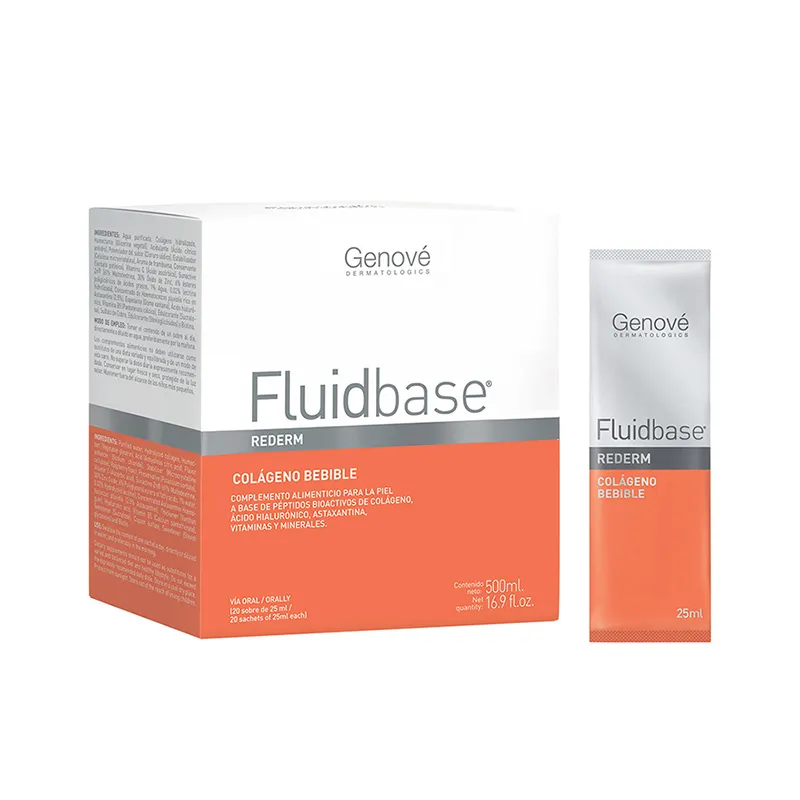 Fluidbase Rederm Colágeno Bebible es un complemento alimenticio a base de pépti-dos bioactivos de colágeno, ácido hialurónico, astaxantina, vitaminas y minerales.