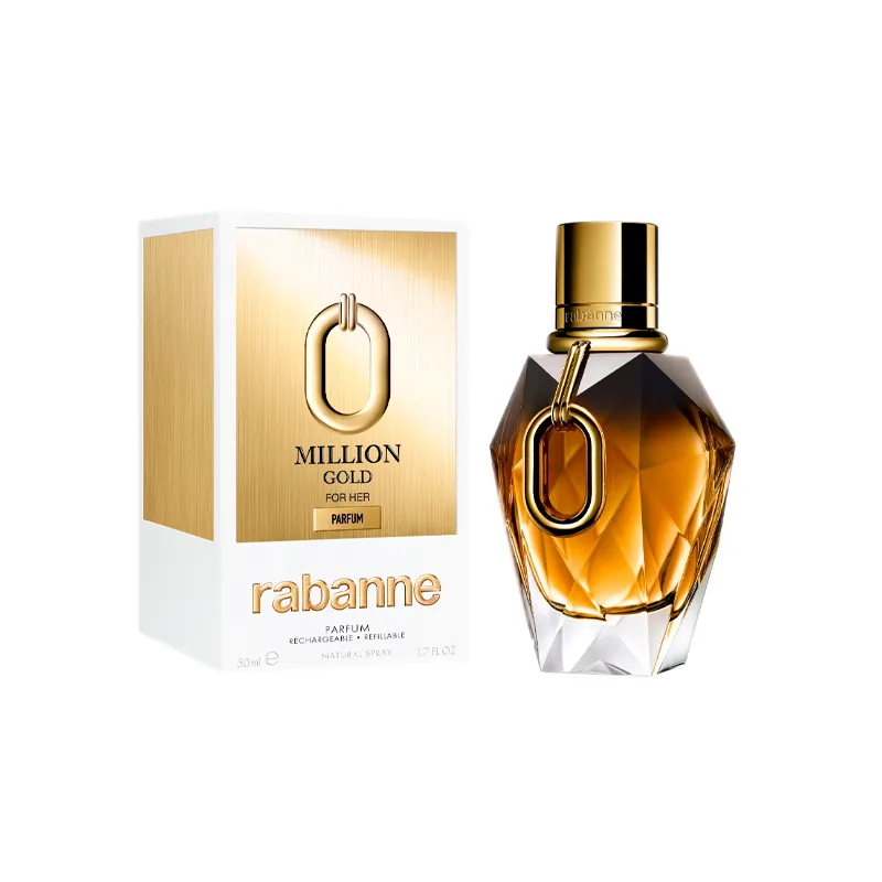 Million Gold for Her Parfum galvaniza el gran floral de Rabanne con una nueva intensidad ardiente y amaderada. Una rica y cálida adicción de sándalo destella la fantasía dorada sobre un acorde floral ultrafemenino de absoluto de jazmín luminoso e ylang ylang solar.